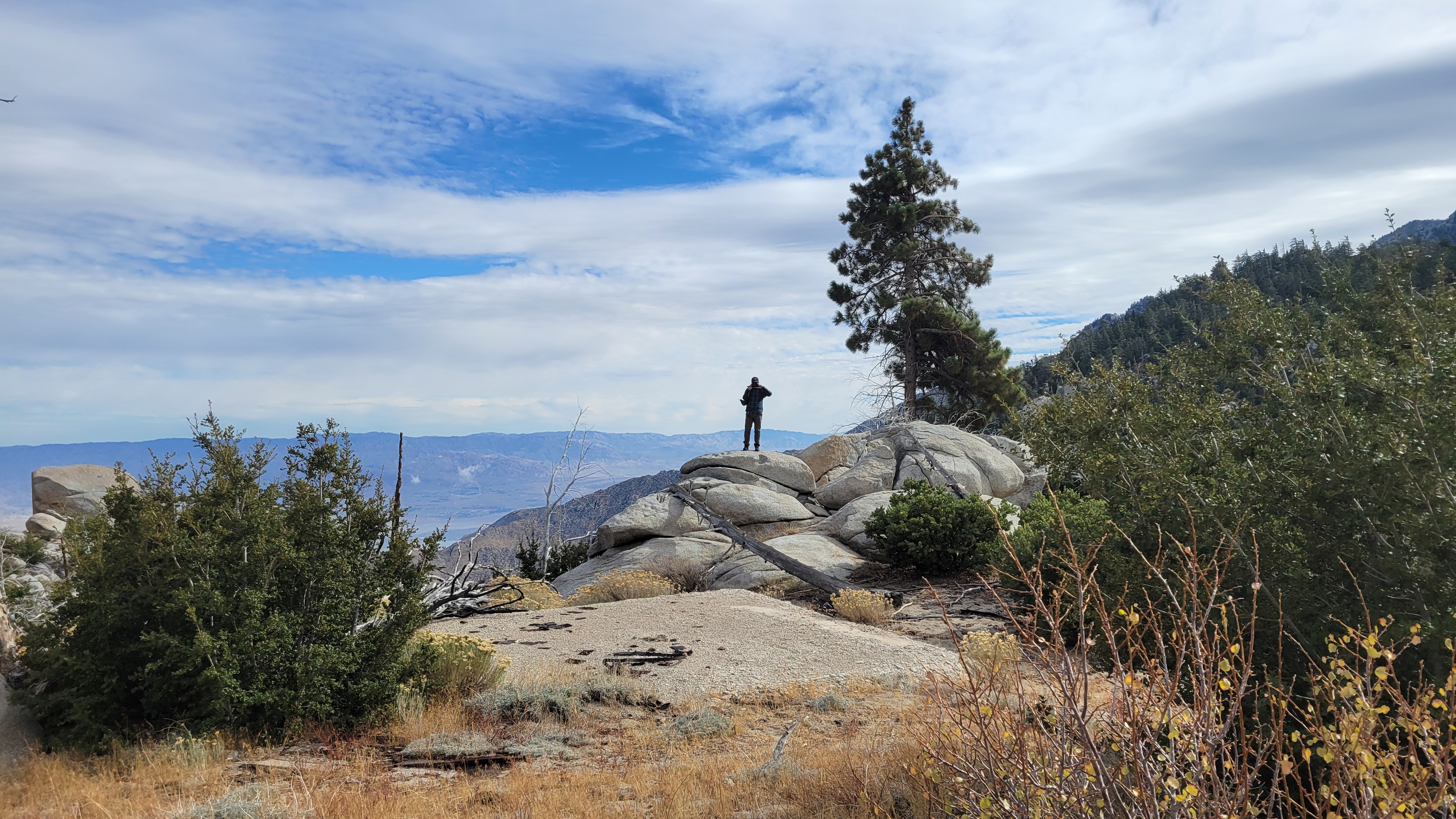 Higher up, the terrain opened to a dramatic rocky ridgeline. From the edge, you could look straight down into the desert — wind turbines dotting the valley floor, the San Gorgonio Pass stretched out wide, and layer after layer of distant mountain ranges fading into haze. The granite here was smooth and sun-bleached, scattered with hardy shrubs and a few wind-bent pines clinging to the exposed rock. It felt like standing on the edge of two completely different worlds — lush mountain forest behind you, vast arid desert ahead.