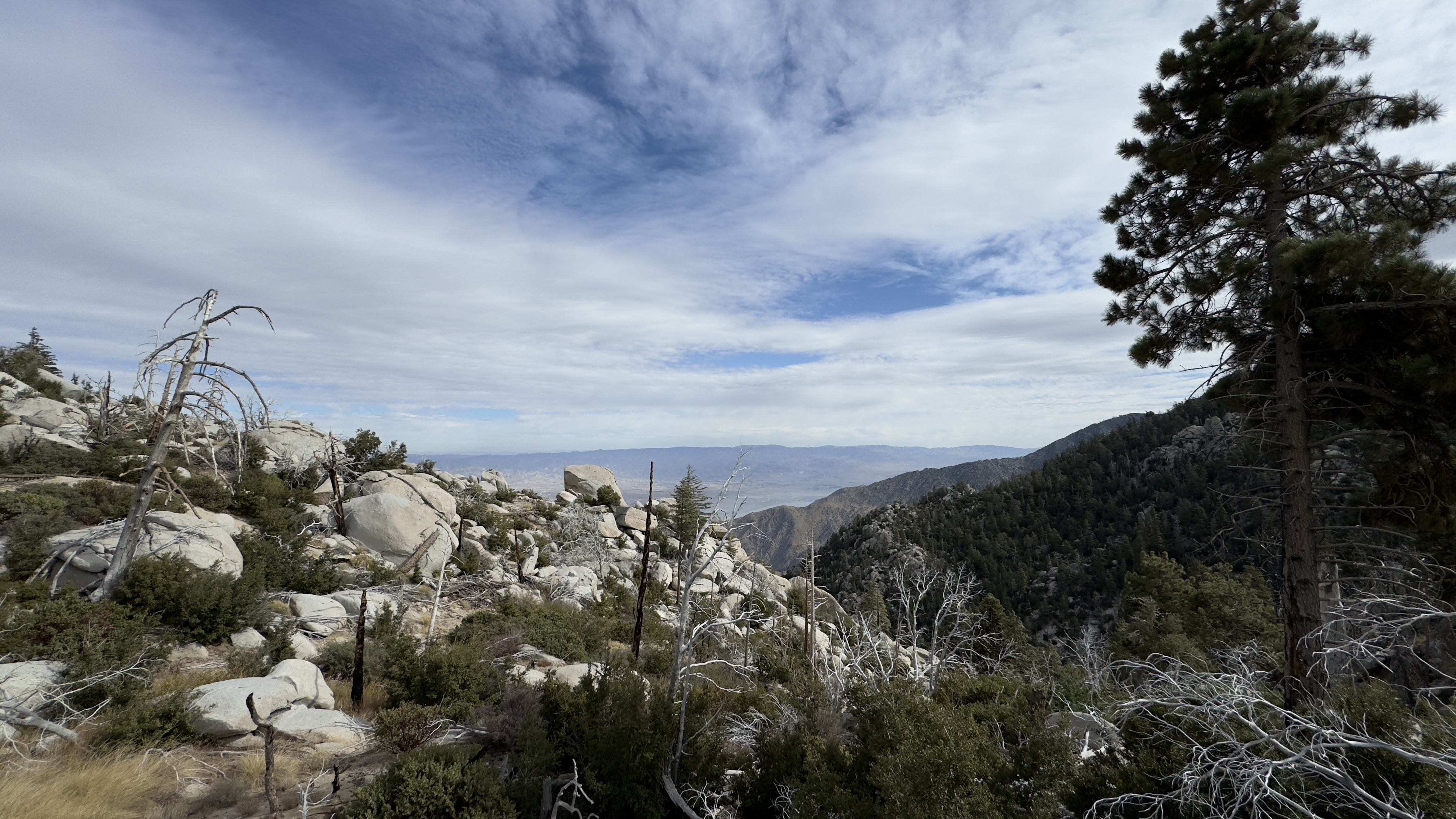 Higher up, the terrain opened to a dramatic rocky ridgeline. From the edge, you could look straight down into the desert — wind turbines dotting the valley floor, the San Gorgonio Pass stretched out wide, and layer after layer of distant mountain ranges fading into haze. The granite here was smooth and sun-bleached, scattered with hardy shrubs and a few wind-bent pines clinging to the exposed rock. It felt like standing on the edge of two completely different worlds — lush mountain forest behind you, vast arid desert ahead.